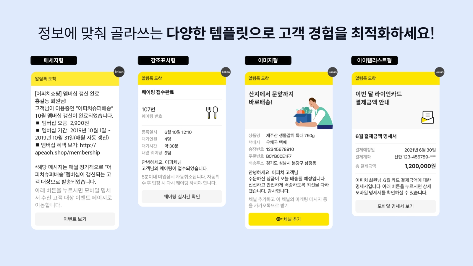 전달하고자 하는 정보에 따라 메시지형, 강조형, 이미지형, 아이템리스트형 템플릿을 선택할 수 있어요.