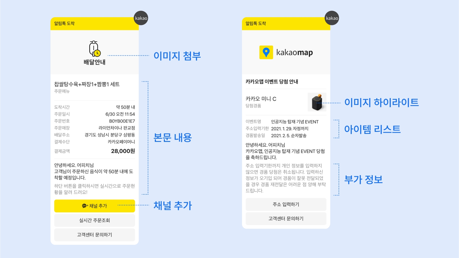부가정보형: 알림톡 본문 하단에 노출되며, 유의 사항 등 부가 정보를 노출하기에 적합해요.