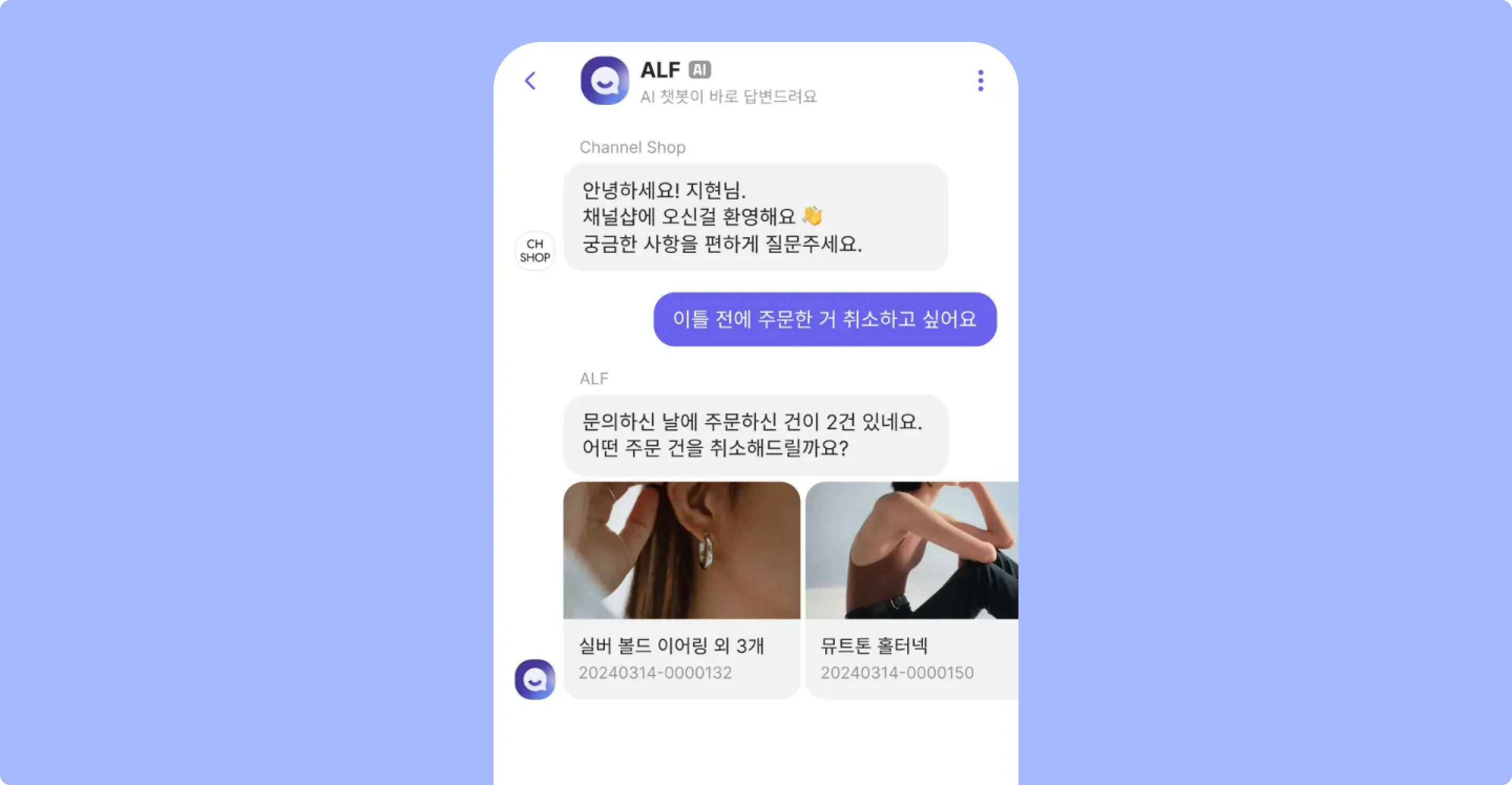 ALF는 채널톡의 AI에이전트로, 상황에 따라 필요한 기능을 스스로 제안하고 답변해줘요. \
