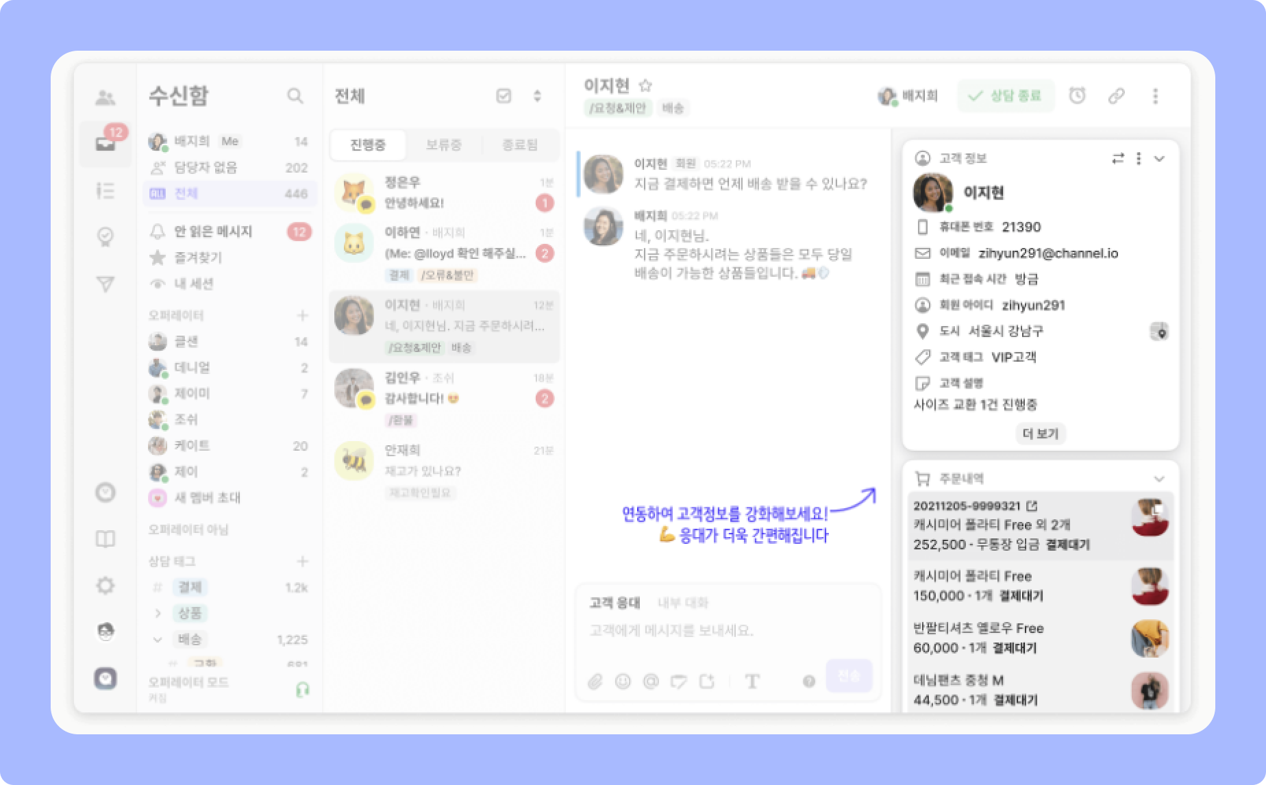 접수된 고객 상담 내용과 고객 정보, 고객 주문 내역을 한 눈에 확인할 수 있어요.