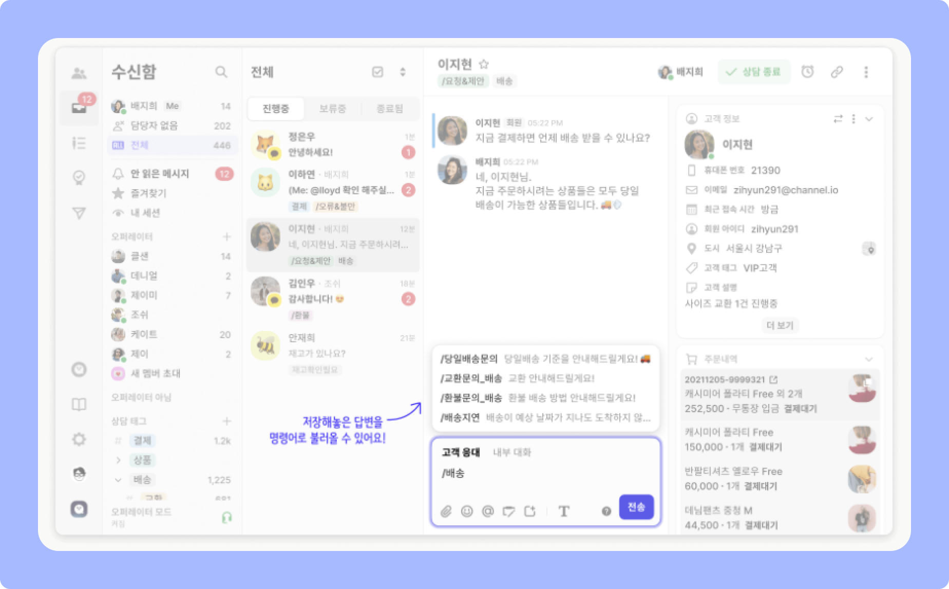 명렁어를 입력하면 저장해둔 답변을 불러올 수 있어요.