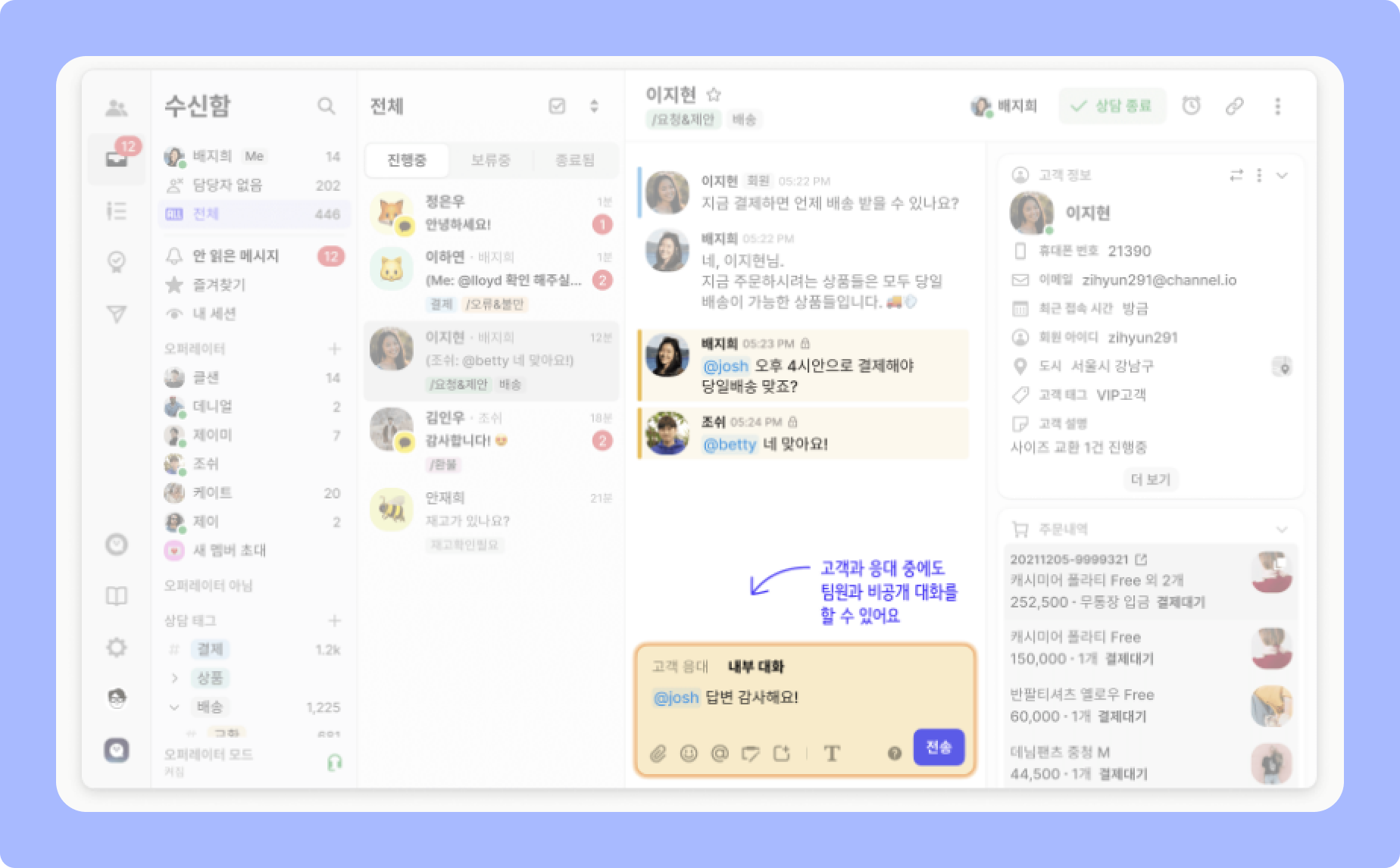 고객 응대 중에도 팀원과 비공개 대화를 하면서 답변에 대한 정보를 주고받을 수 있어요.