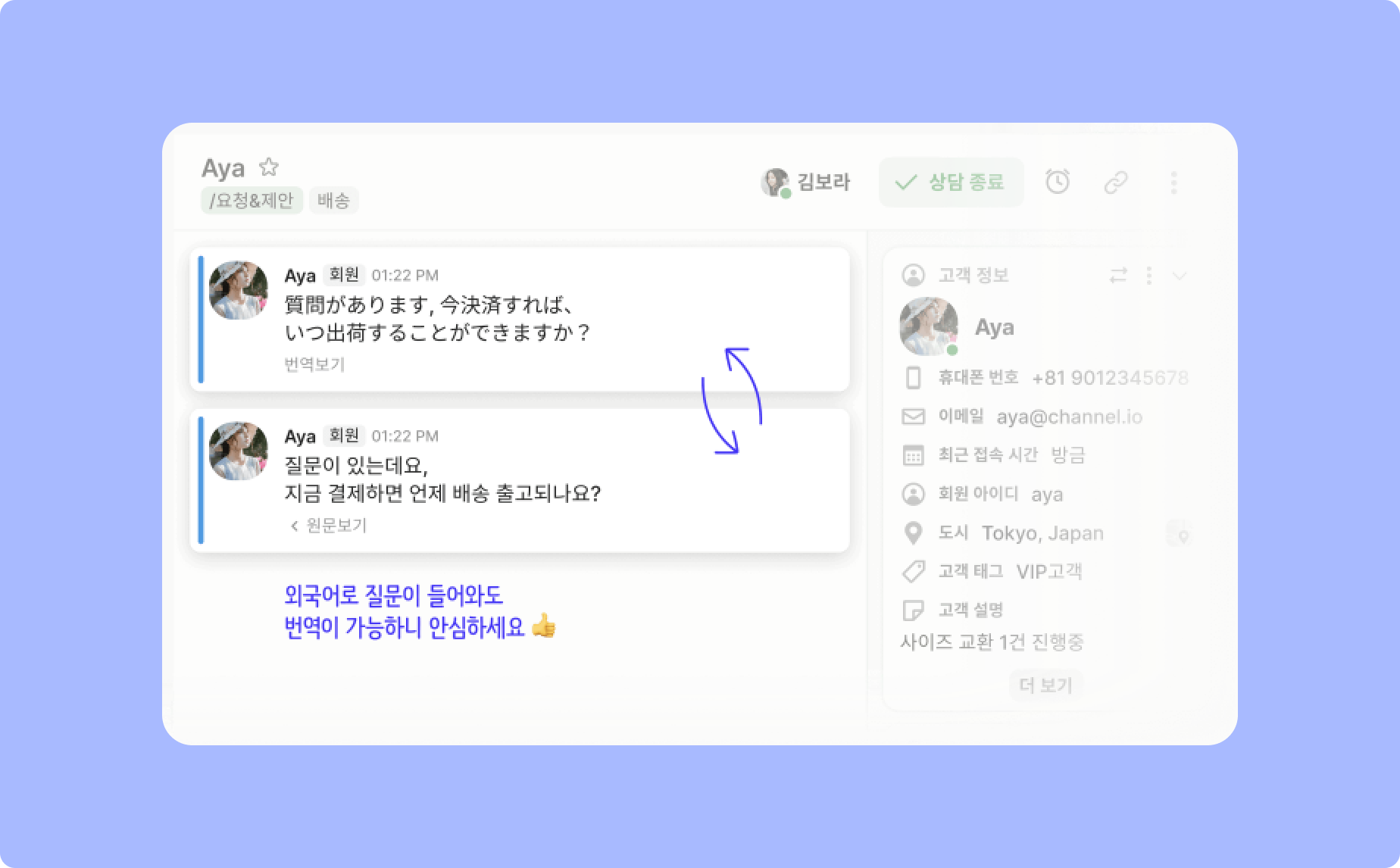외국어로 문의가 들어와도 클릭 한 번으로 번역이 가능해요.