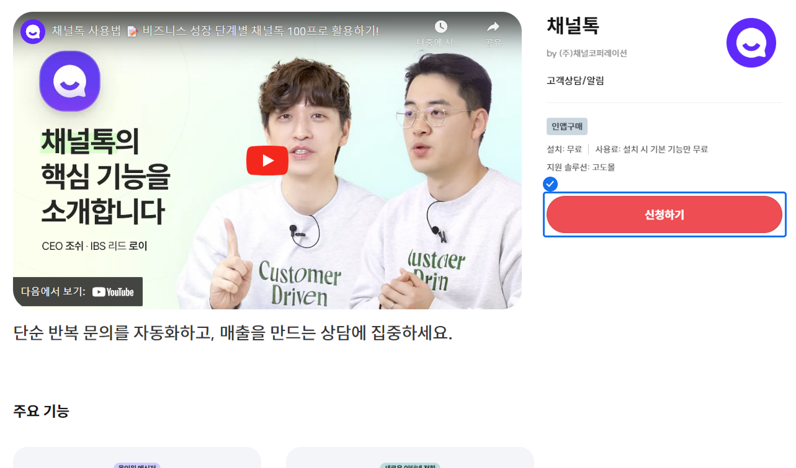 2. [채널톡 페이지](https://apps.nhn-commerce.com/apps/1907)에서 \[신청하기] 버튼을 클릭해요.