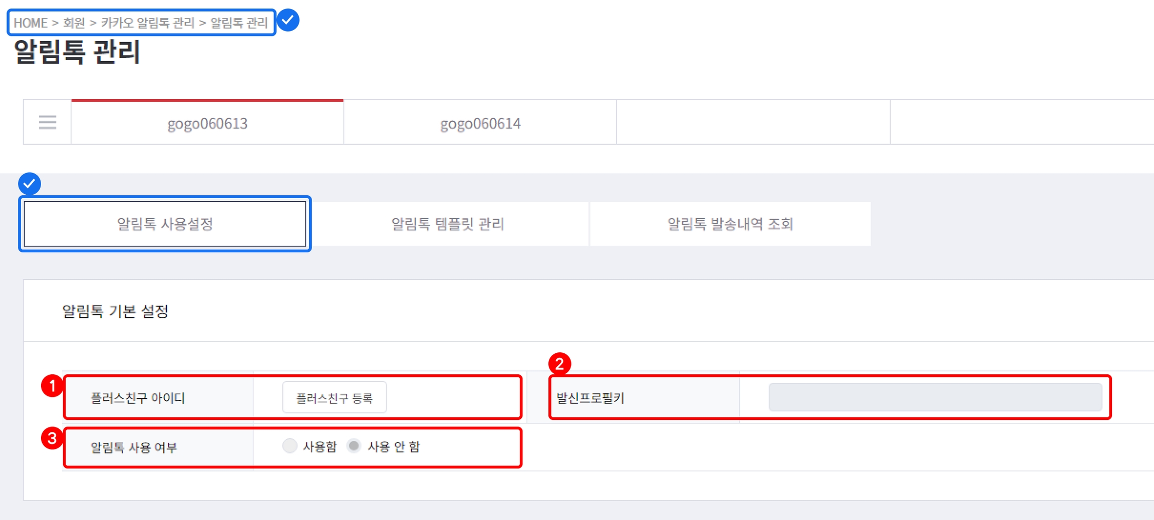 샵바이 관리자 화면에 접속하여 [회원 > 카카오 알림톡 관리 > 알림톡 관리]에서 사용할 수 있어요.