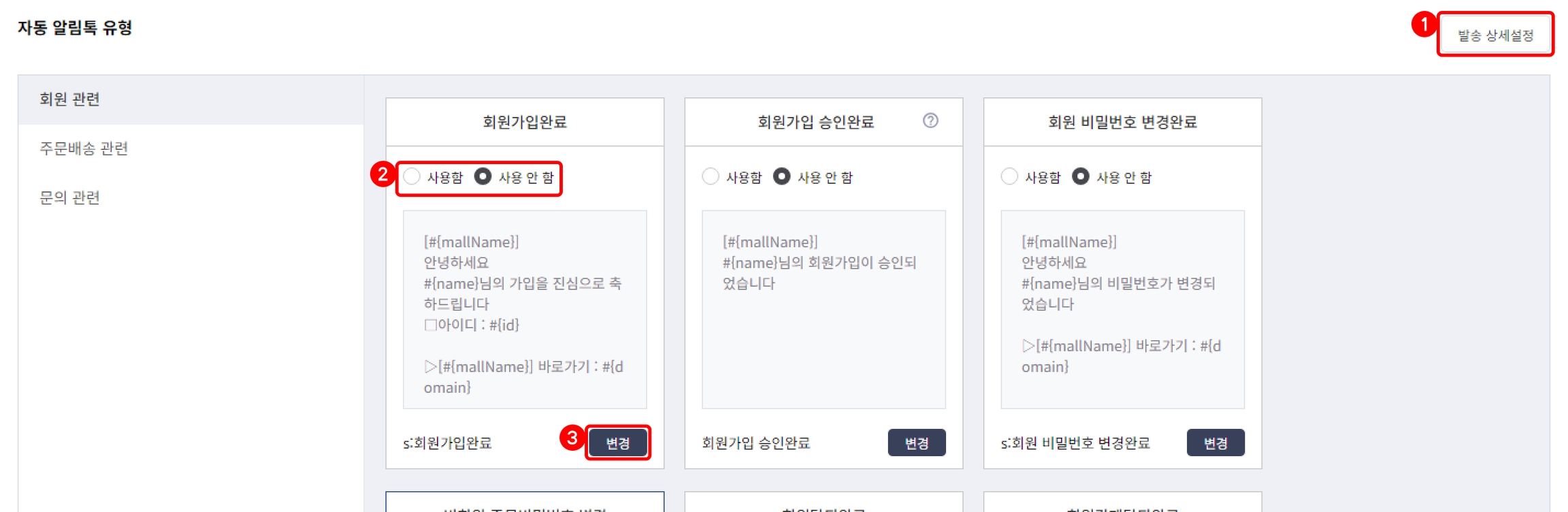 항목별 알림톡 사용 여부 및 템플릿을 설정할 수 있어요.