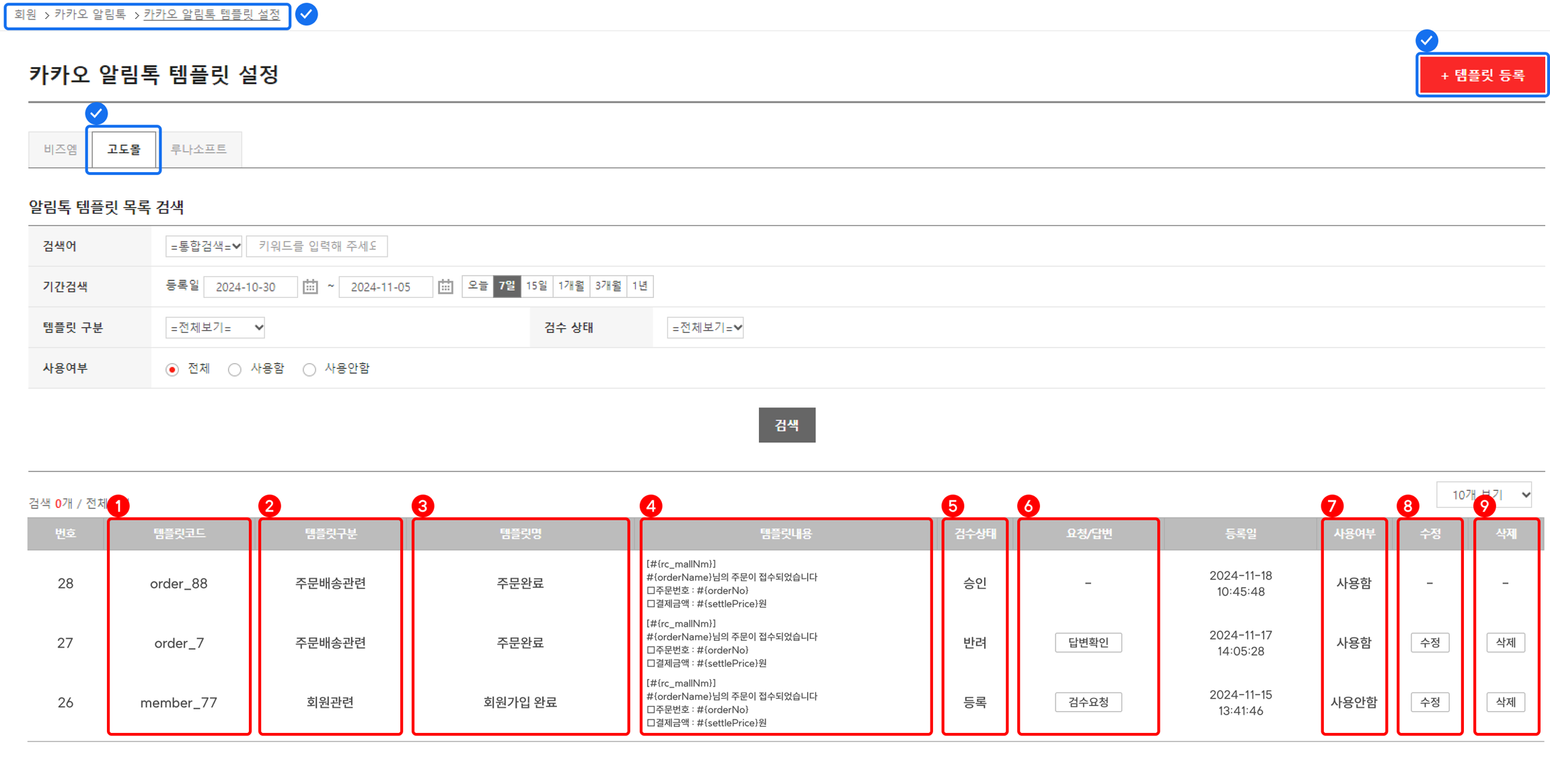 템플릿 명: 템플릿 등록 시 입력한 템플릿 명을 확인할 수 있어요.