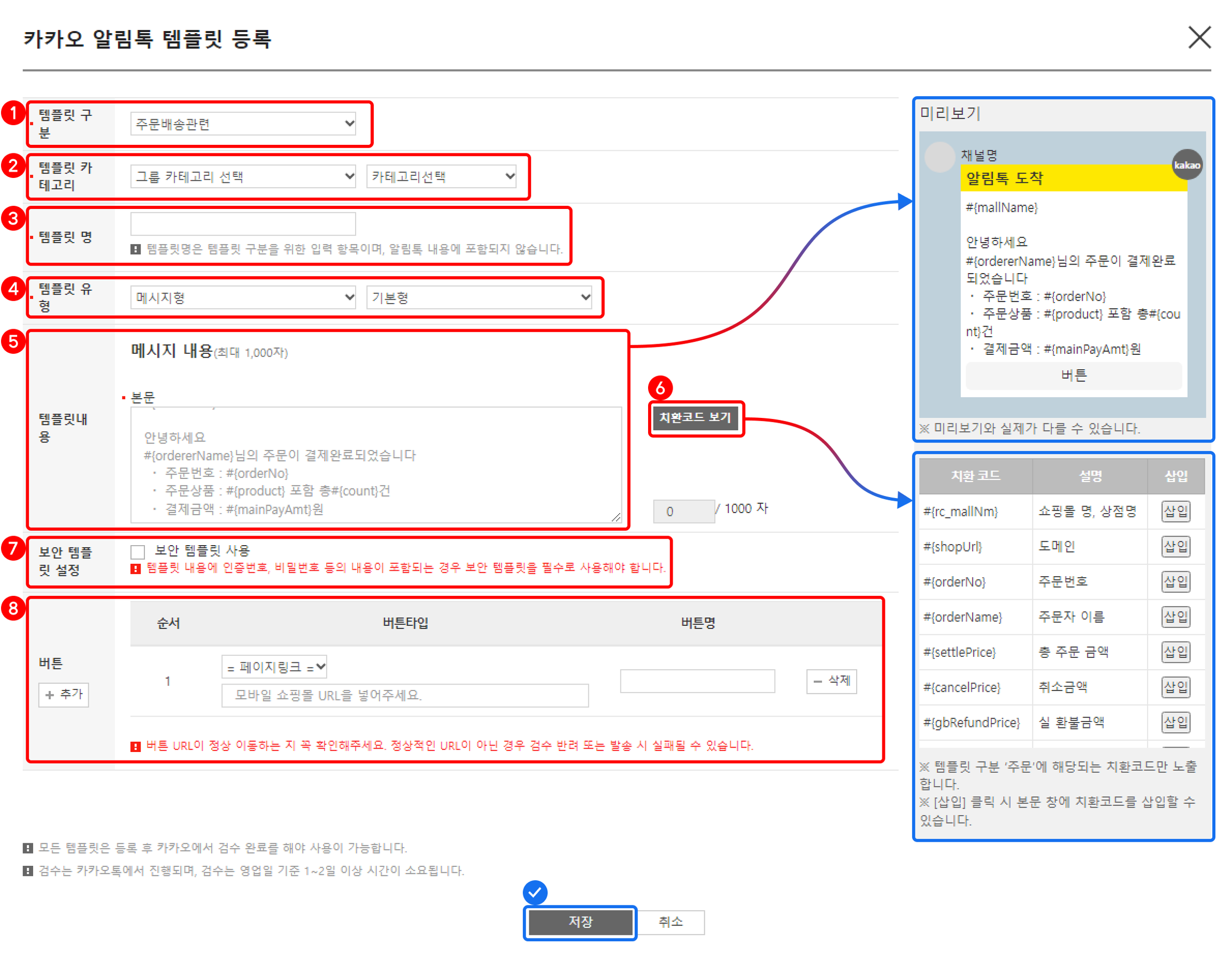 템플릿 내용에 인증 번호, 비밀번호, 신용정보 등의 내용이 포함되는 경우 보안 템플릿을 필수로 사용해야 해요.